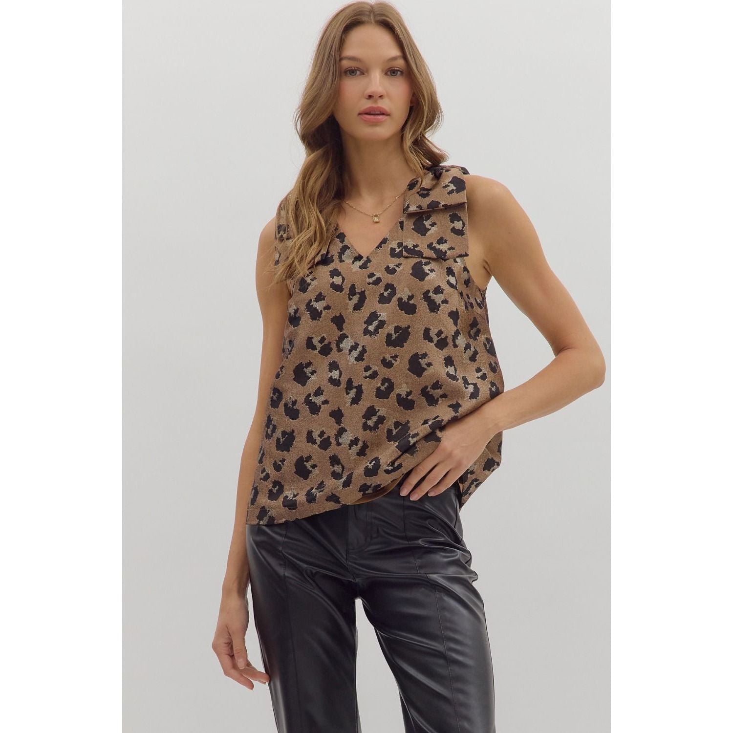 Embrace your bold side with this striking leopard print sleeveless top. The flattering V-neckline pairs beautifully with unique layered flap shoulders that add dimension and visual interest. Crafted from lightweight woven fabric with a full lining for coverage and comfort, this piece delivers effortless style without any sheer spots. Perfect for layering or wearing solo, it's a versatile wardrobe essential that celebrates your confidence.