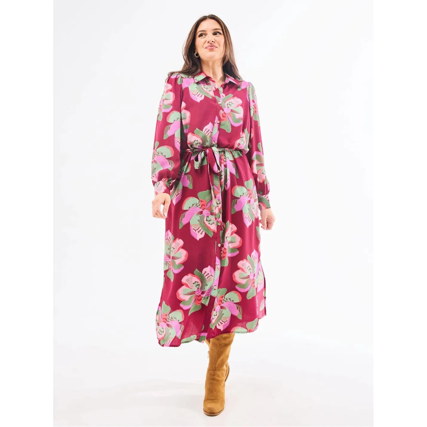 This plum-colored floral dress features a midi length, long sleeves, and a tie belt for a flattering fit.