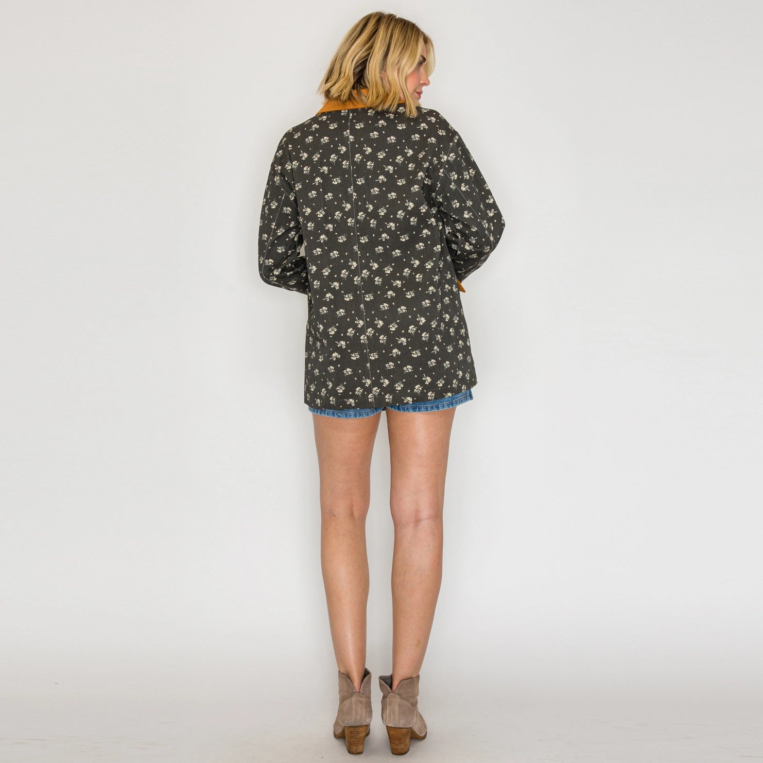 Bring a touch of countryside charm into everyday style with this barn jackets with floral quilted jacket. Designed with a structured fit, it features a delicate ivory flower print on a dark base for a balanced, feminine yet grounded look. The contrasting camel suede collar and cuffs add warmth, texture, and a vintage-inspired edge. Button-down closure ensures easy layering, while its lightweight quilted design makes it perfect for transitional weather. Whether paired with denim skirts, casual dresses, or tailored trousers, this jacket delivers versatility with a timeless appeal.