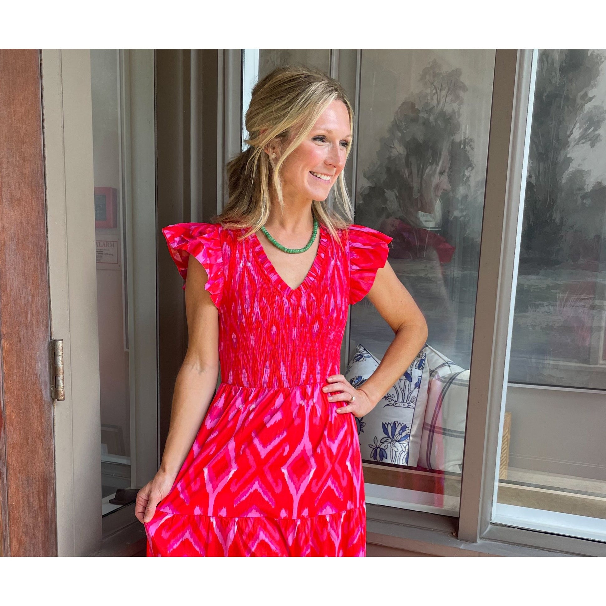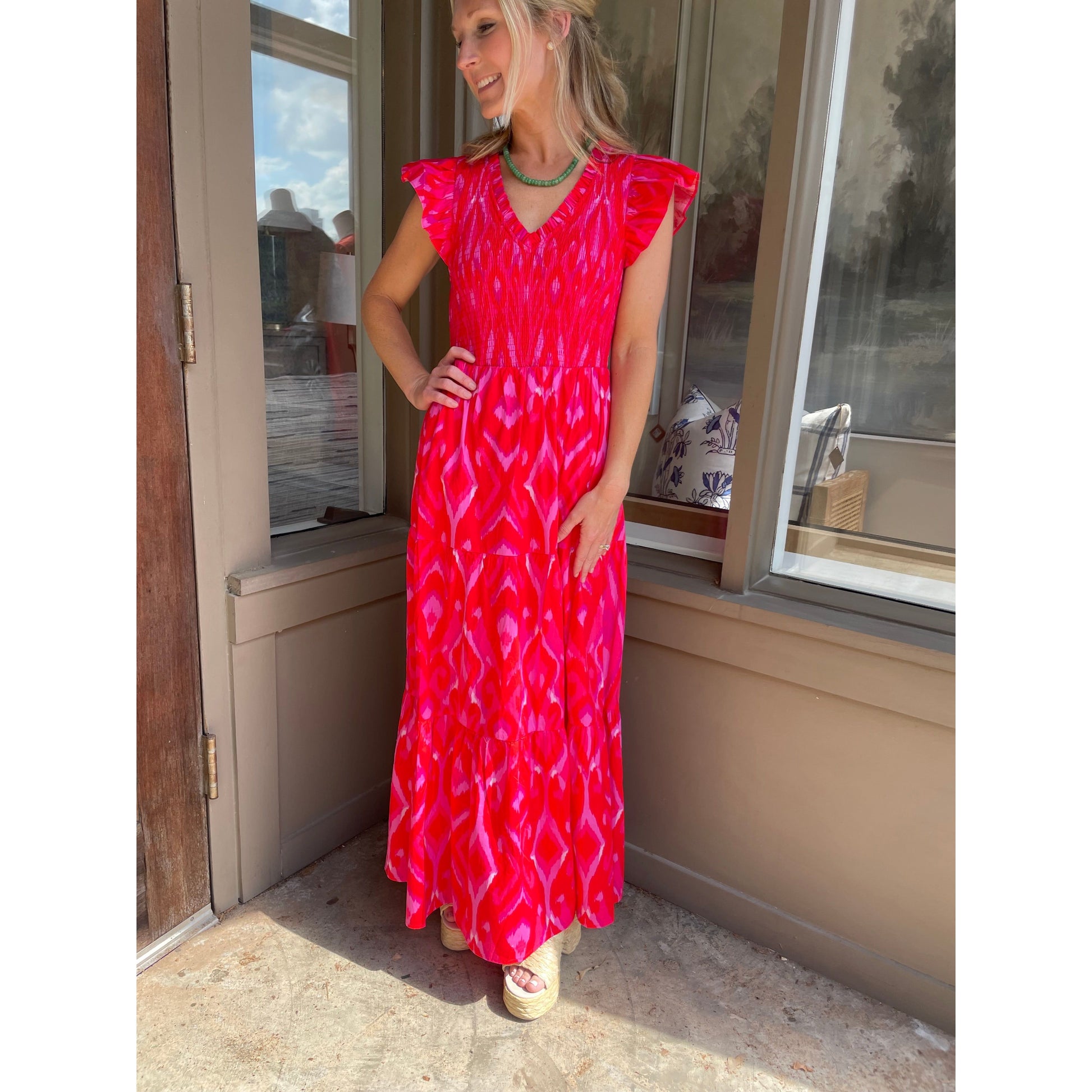 Prepare for a beautiful day in the Blevin Ikat Sunfire Dress. This midi dress features a flattering smocked bodice, ruffle cap sleeves, and a V-neckline, maintaining a fit and flare silhouette and a tiered maxi skirt. Complete the look with stylish heels.