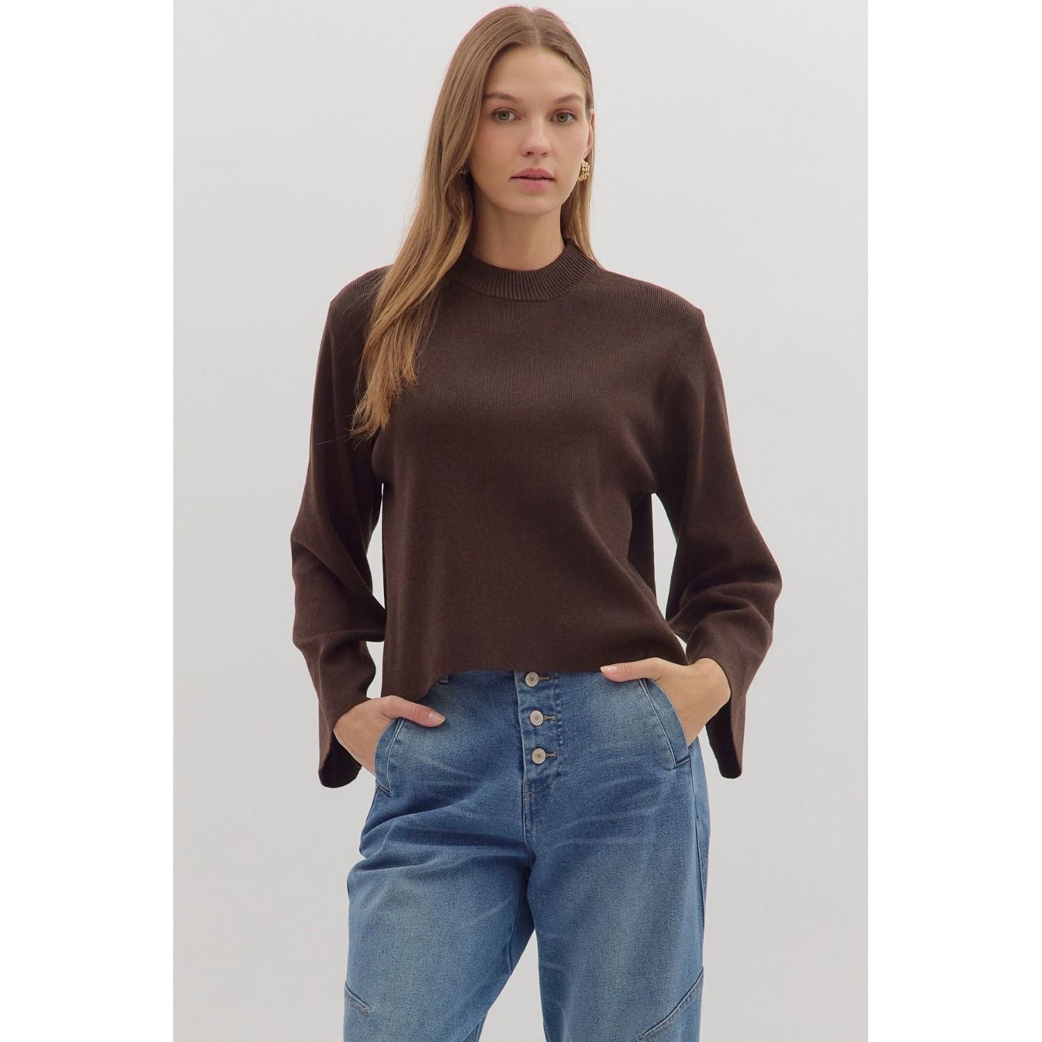 A lightweight brown pullover with a mock neck and bell sleeves that transitions beautifully through seasons. The relaxed fit keeps you comfortable all day, while the warm tone pairs easily with jeans, trousers, or skirts.