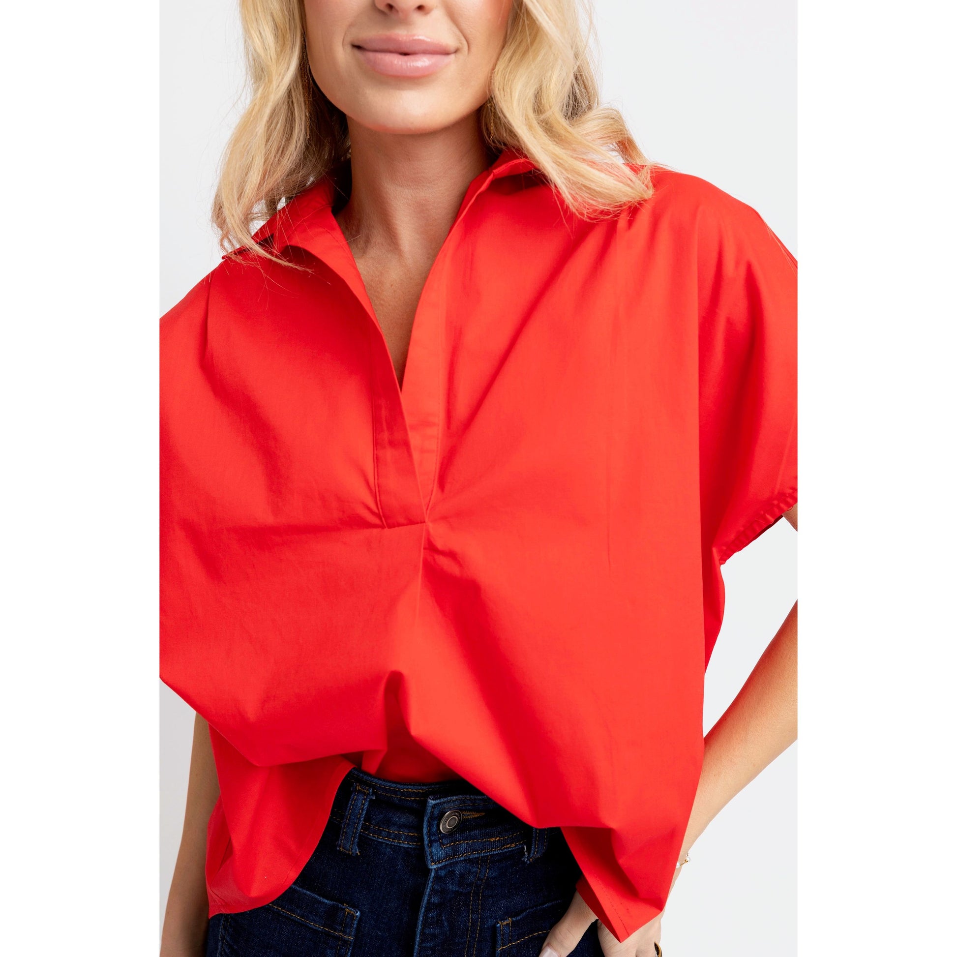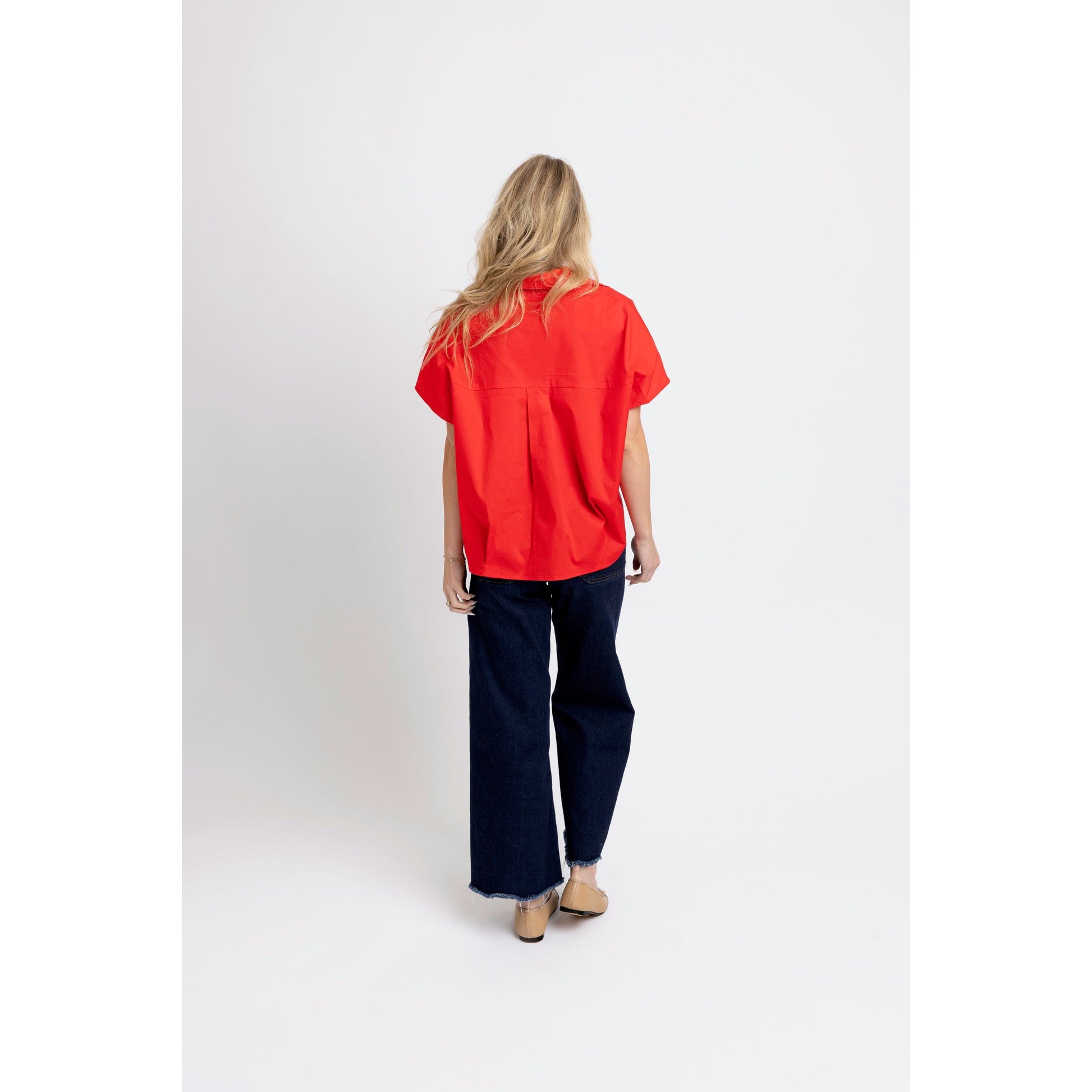 A classic red V-neck top in crisp poplin fabric. Wear it alone or layer it with ease. The structured material keeps its shape all day, making it a dependable piece for any wardrobe.