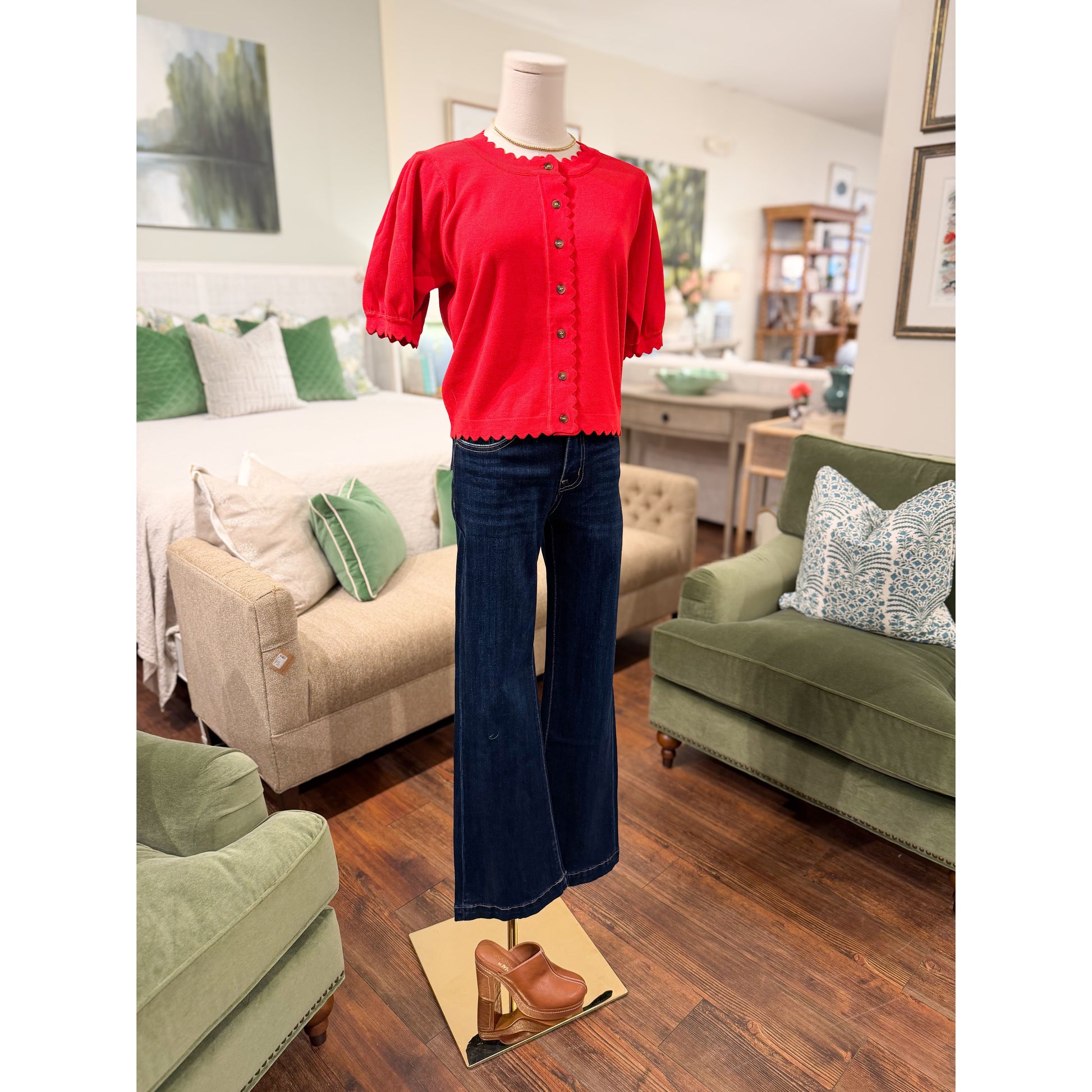 A charming red cardigan featuring short sleeves and delicate scalloped detailing that adds a touch of elegance to any outfit. Perfect for layering over your favorite pieces.