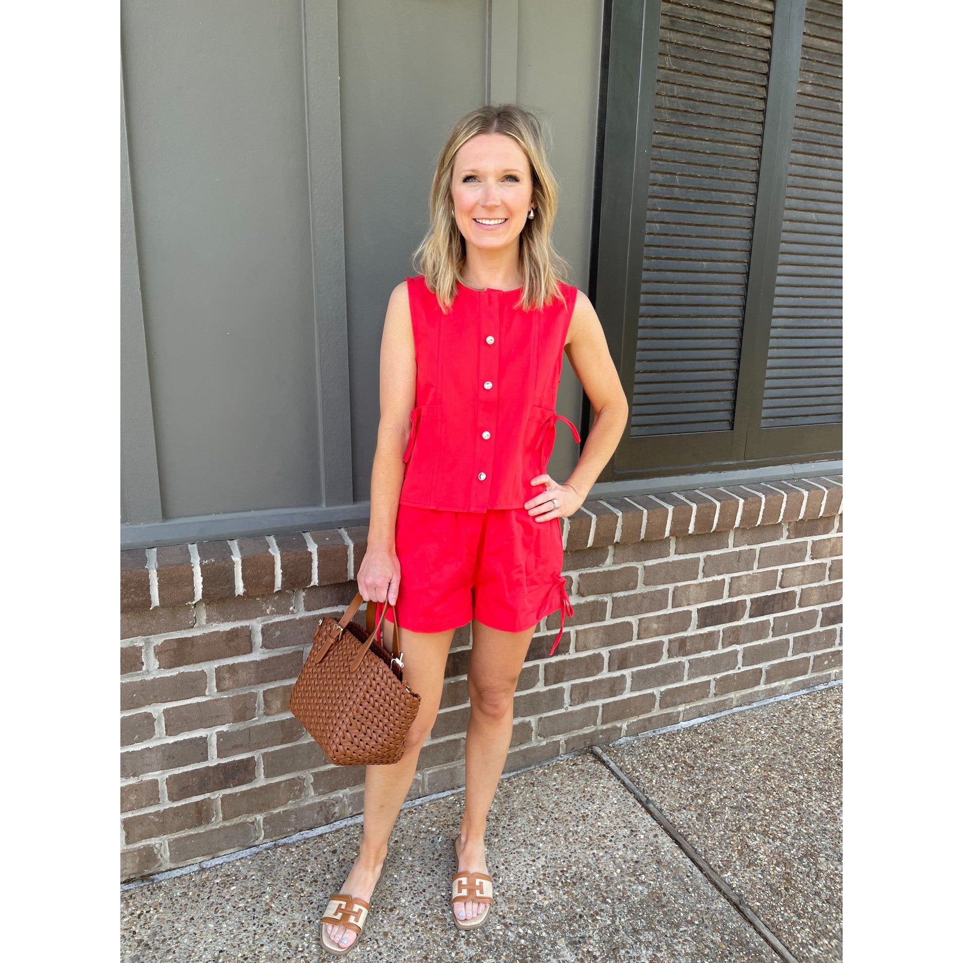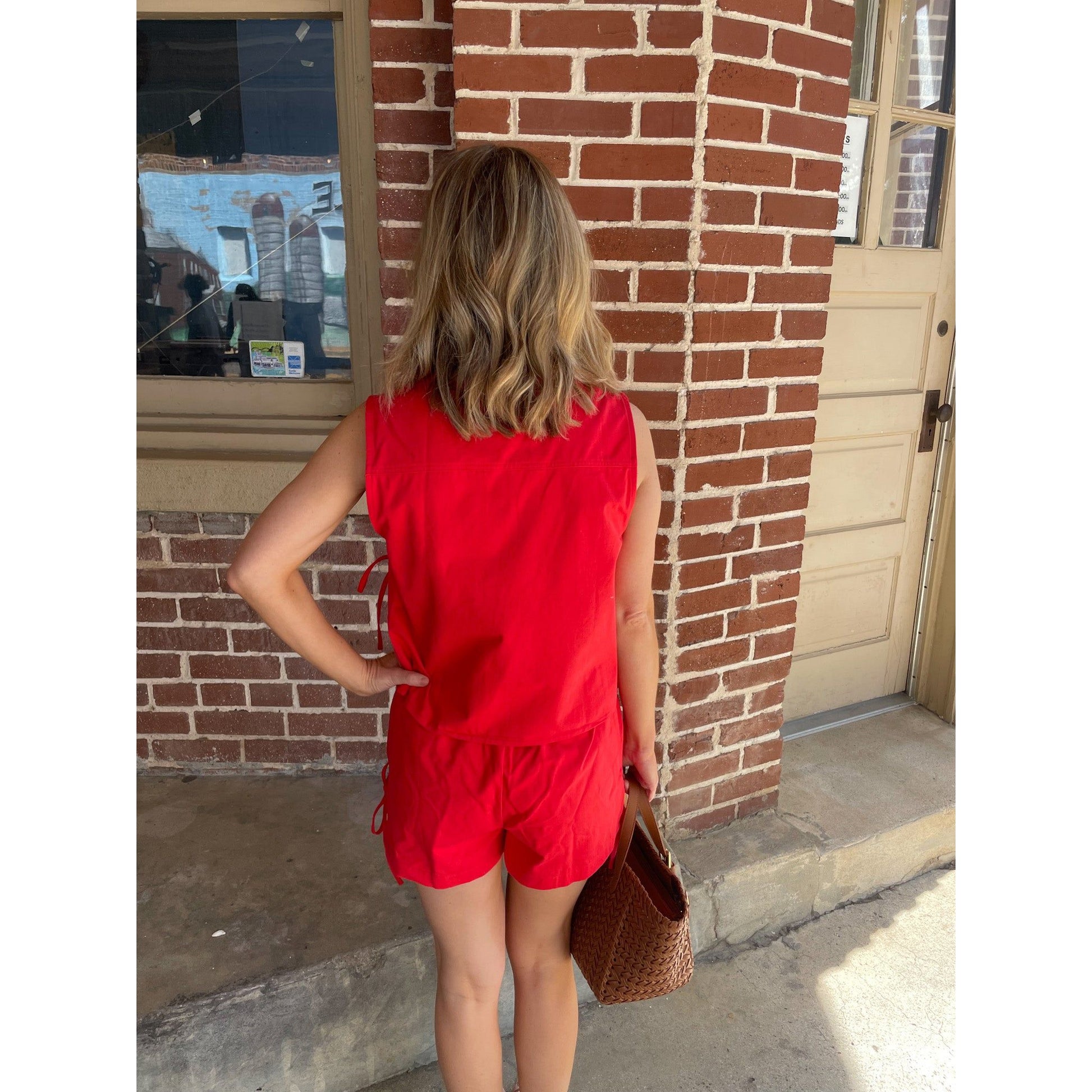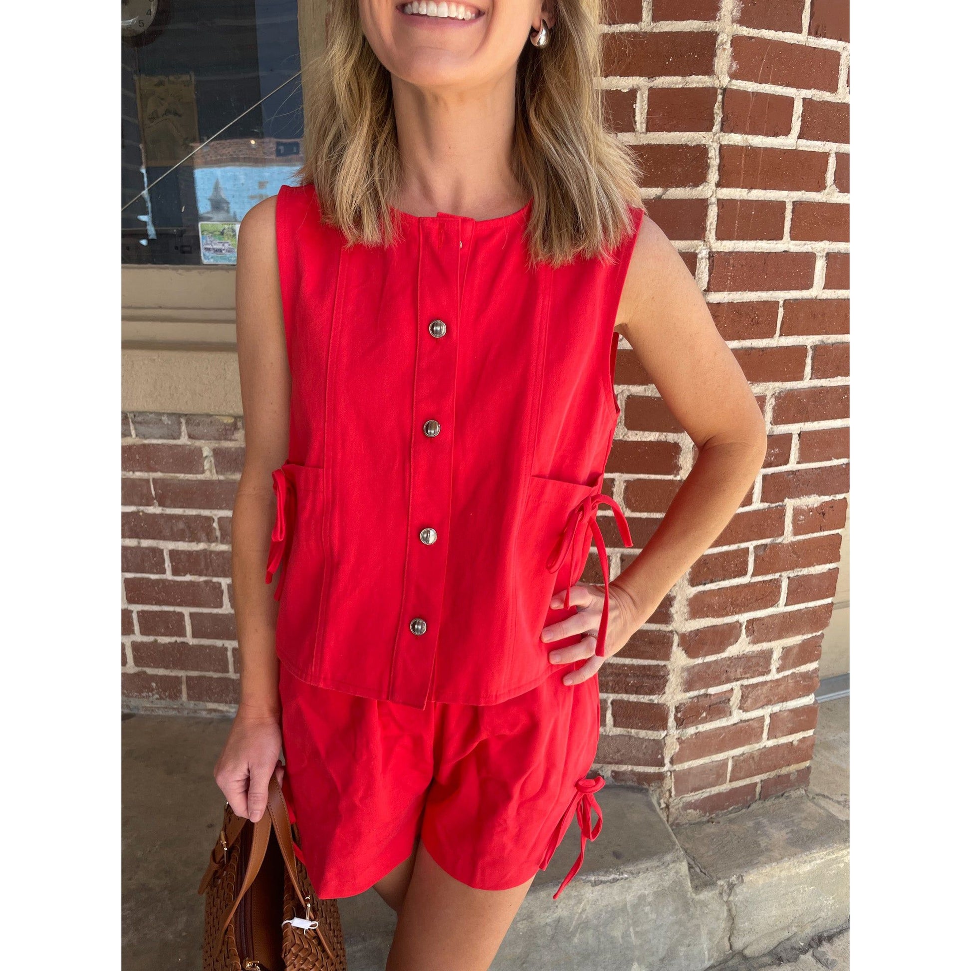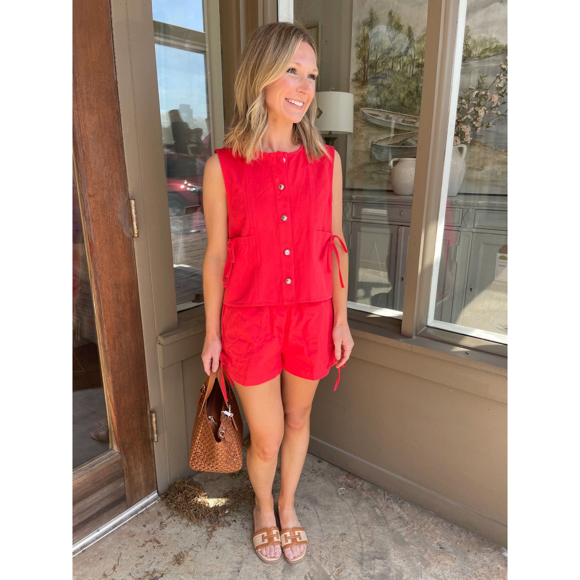 The Ellison Set includes a cute red cropped vest with bow detailing and matching elastic waist shorts with bow accents. Our model is 5'2" and wearing a size small.