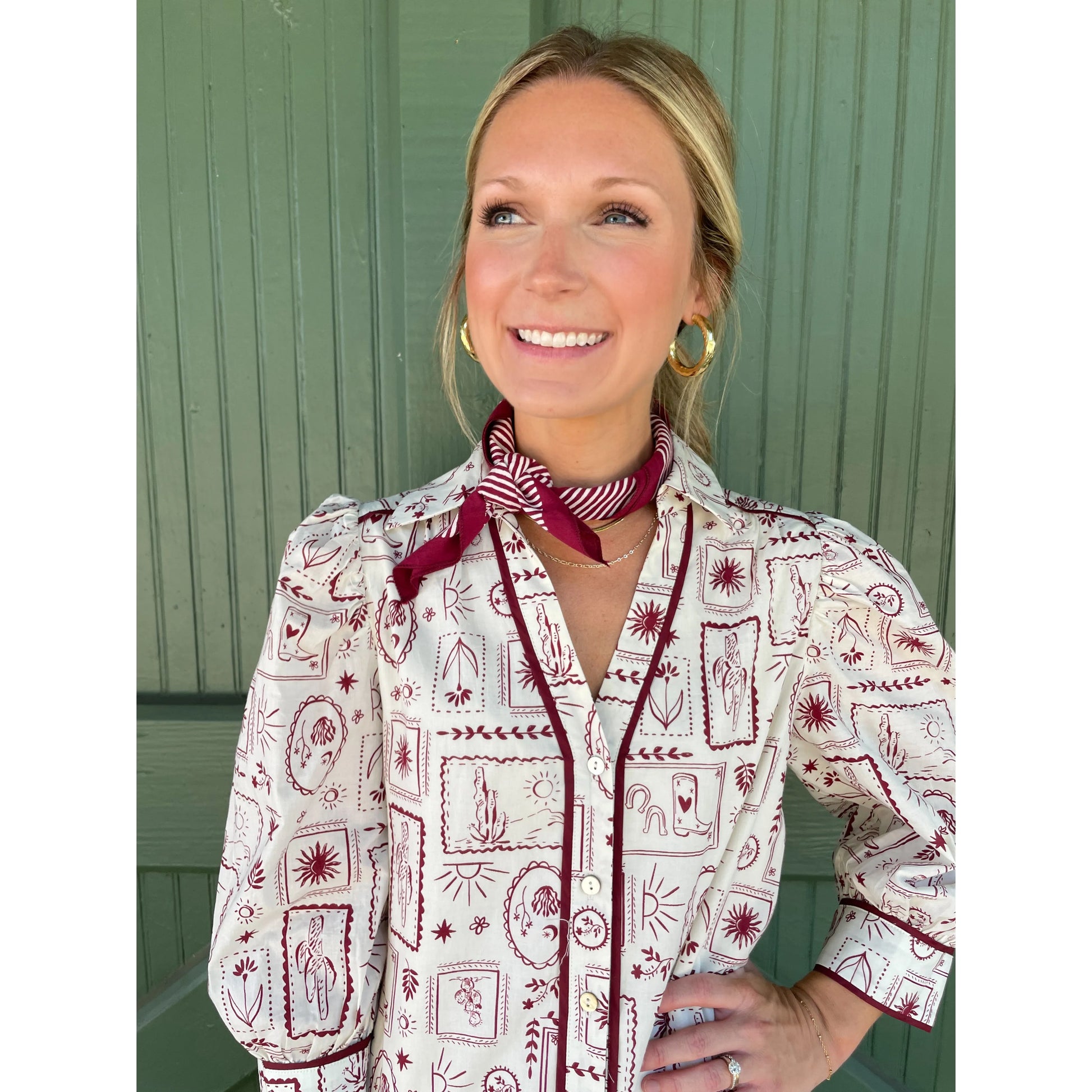 This white dress features a maroon western-inspired print. It includes a collar and quarter-length sleeves, combining style and comfort in a charming look.