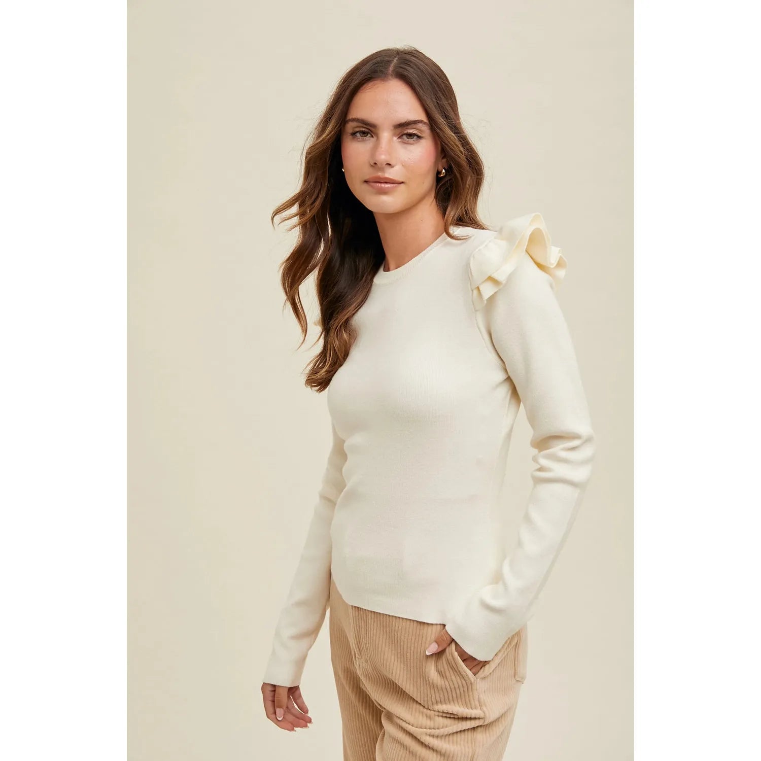 Introducing our newest arrival: the Georgette Top. Featuring ruffled sleeves and a rounded neckline, this cream sweater is ideal for achieving a dressed-down yet sophisticated style.