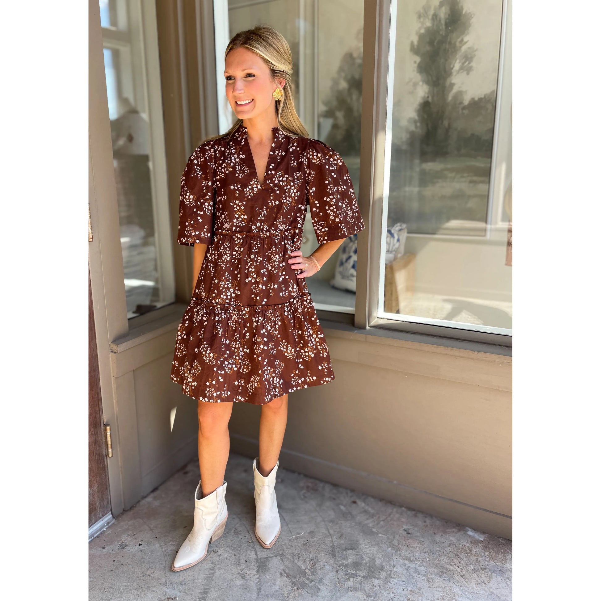 The Gibson Floral Dixie Split Neck Shift Dress is a true versatile piece you must have your closet. It has a split neckline that's framed by gathered short sleeves. It maintains an A line frame with ruffle lined tiers. Easy to pair up with some cute matching strappy heels.