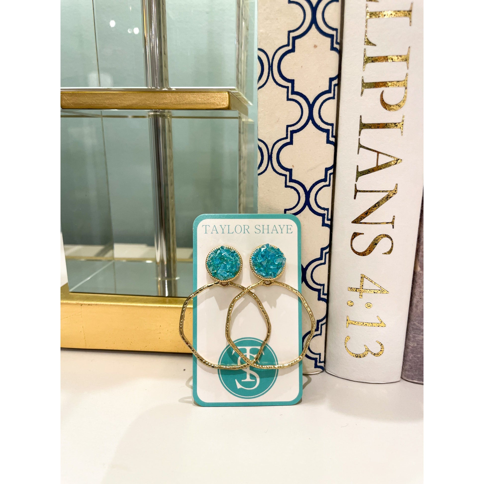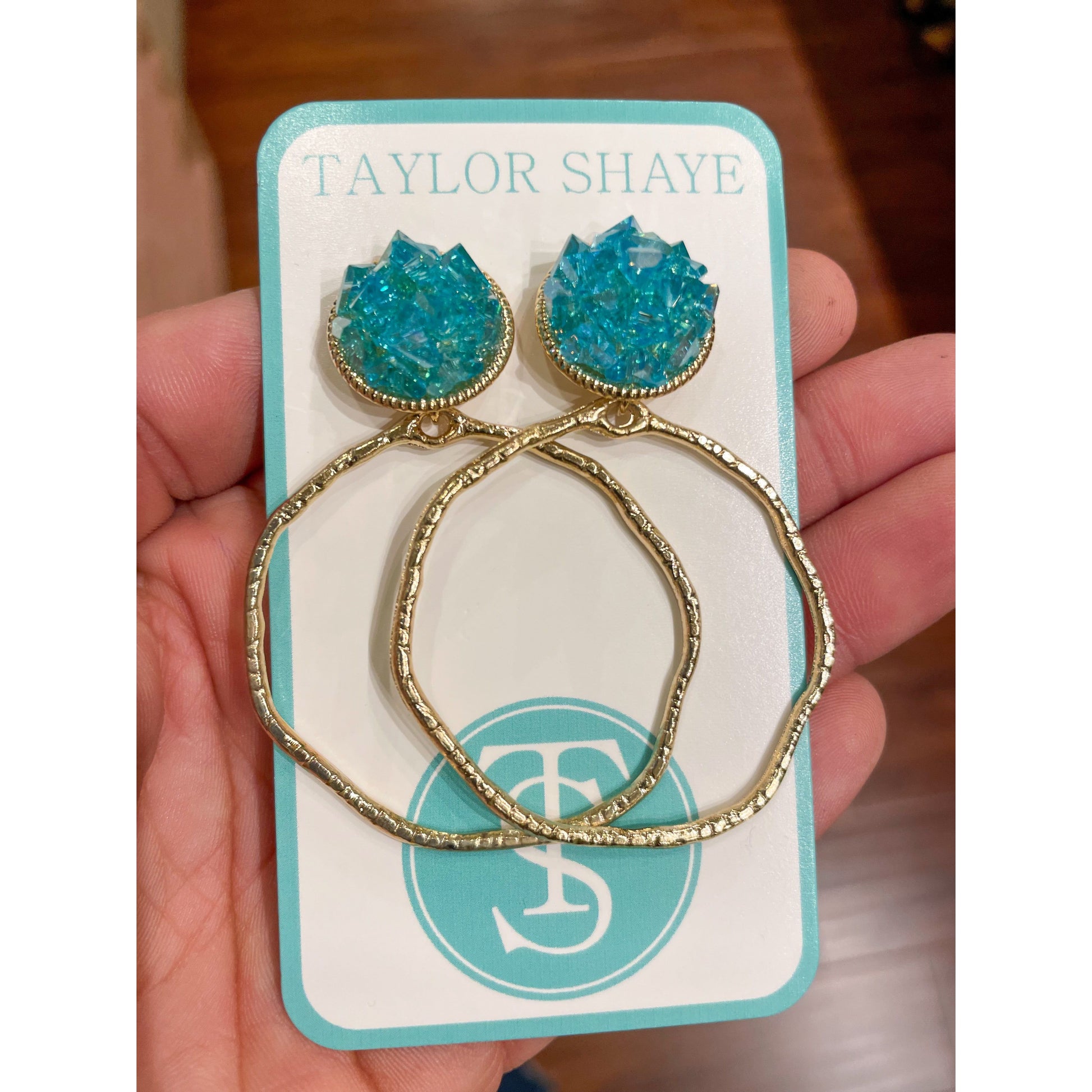 These delightful Glitter Stone Earrings feature aqua stones on gold hoop drops, perfect for adding a touch of sparkle to any outfit.