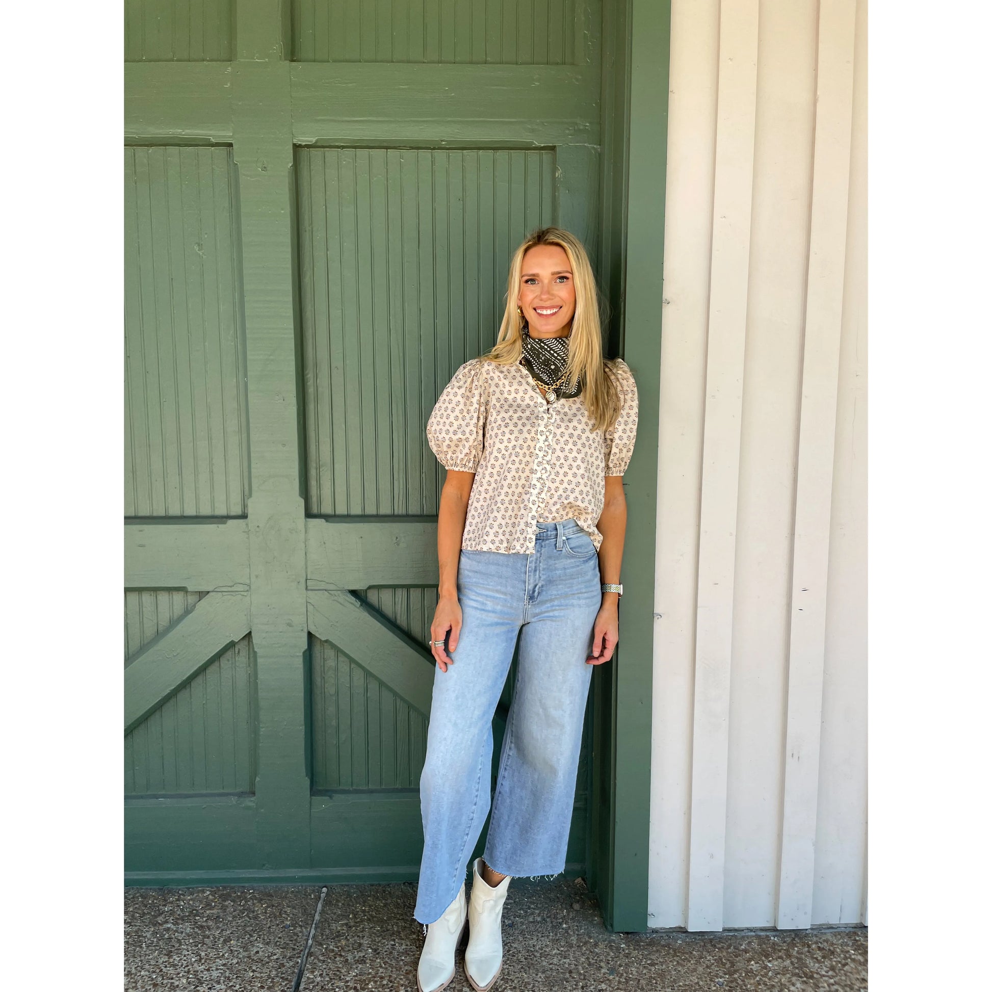 This cream-colored floral top features short sleeves and delicate covered buttons, offering a gentle and charming look you'll love.