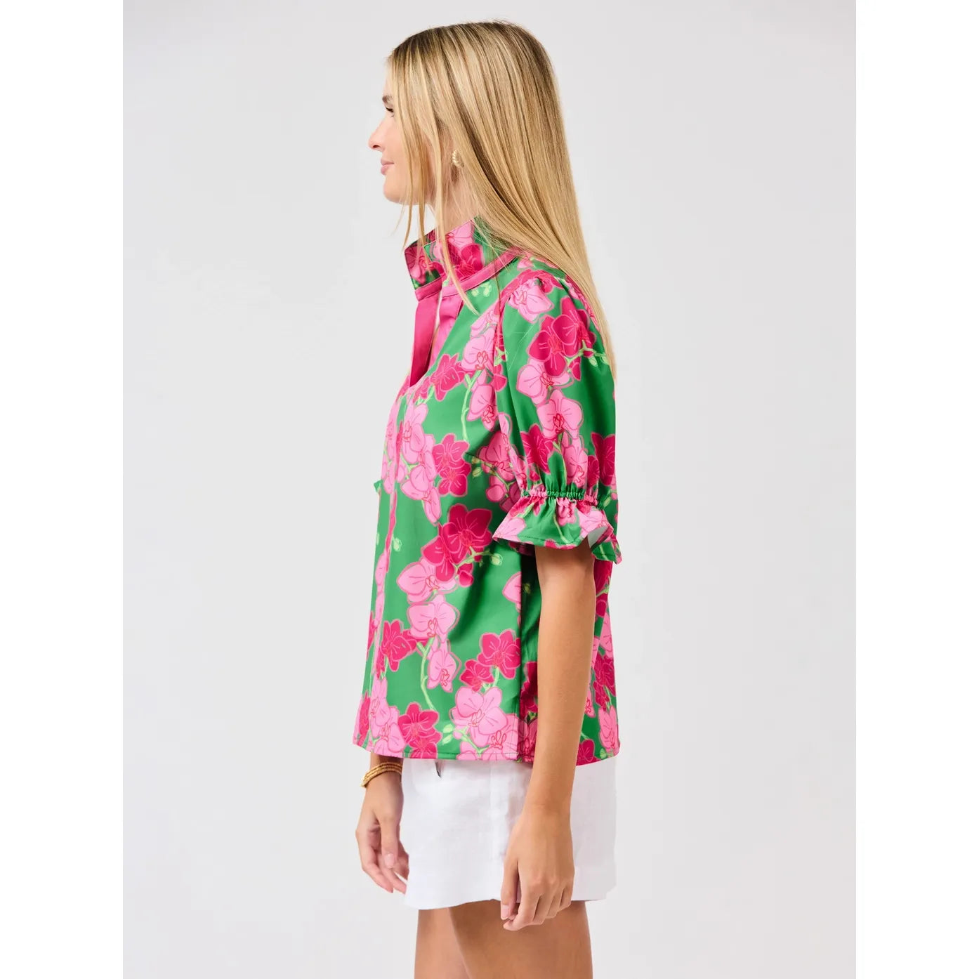 A charming v-neck blouse featuring short sleeves and a vibrant floral print in shades of pink, red, and green. Perfect for adding a pop of color to your everyday wardrobe.