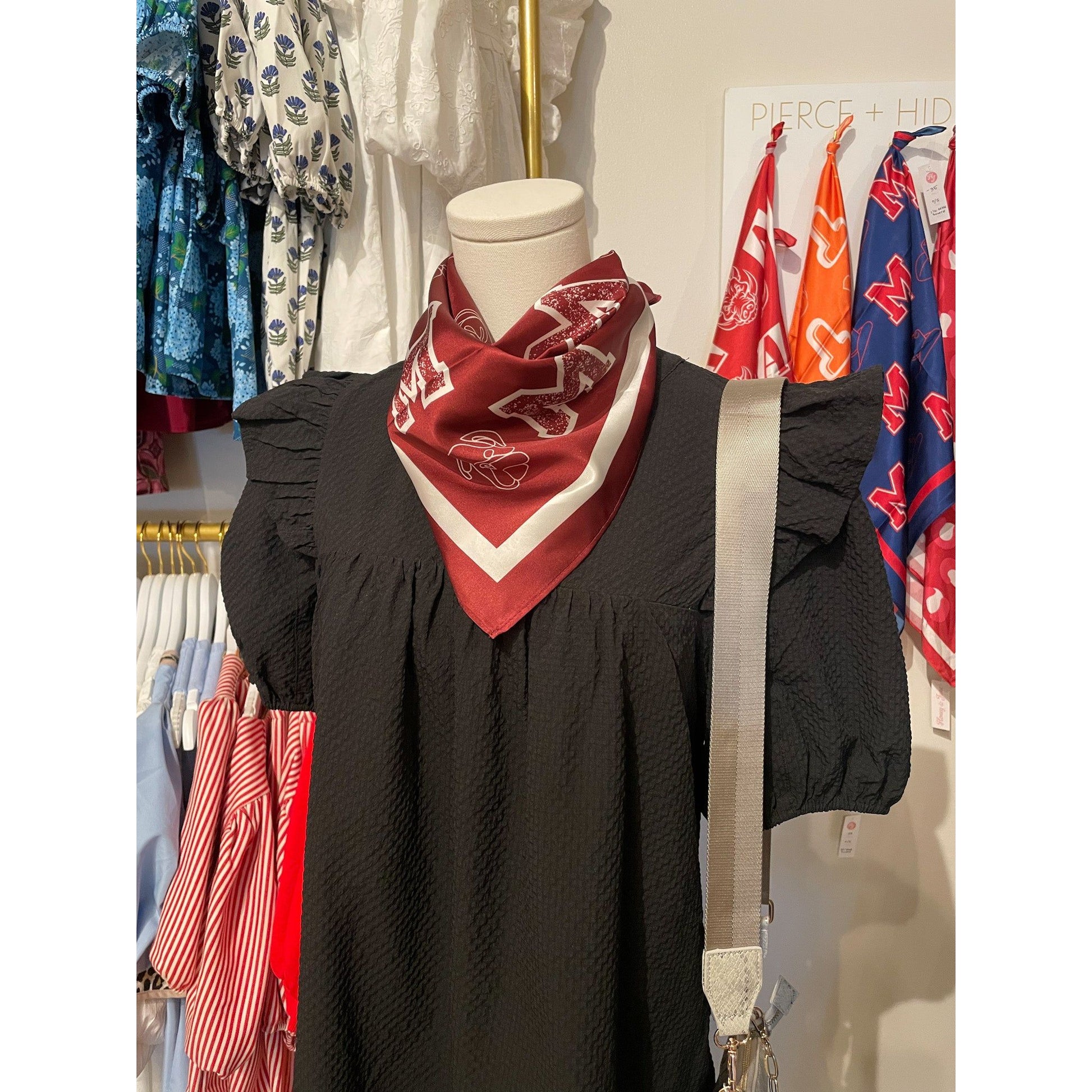 The perfect accessory to be the best dressed in the stands on gameday! Measures: 22" x 22" perfect for neck, hair or purse. Faux Silk: 100% polyester, one sided printing.