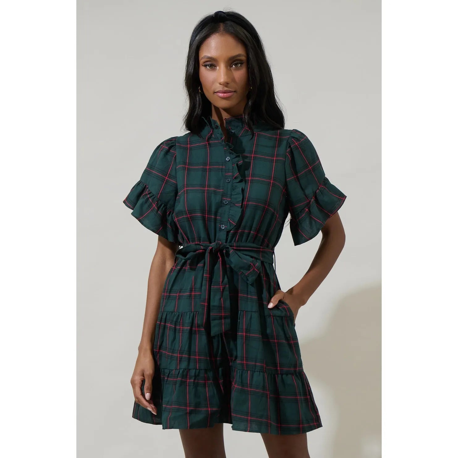 All your fall looks will be elevated this season with the addition of the Brook Plaid Cottonwood Ruffle Button Down Mini Dress. A green multi plaid pattern shapes this mini dress that has short sleeves, ruffles, belt around the waist, and a functional button placket at the front. Easy to pair with heels or boots. -