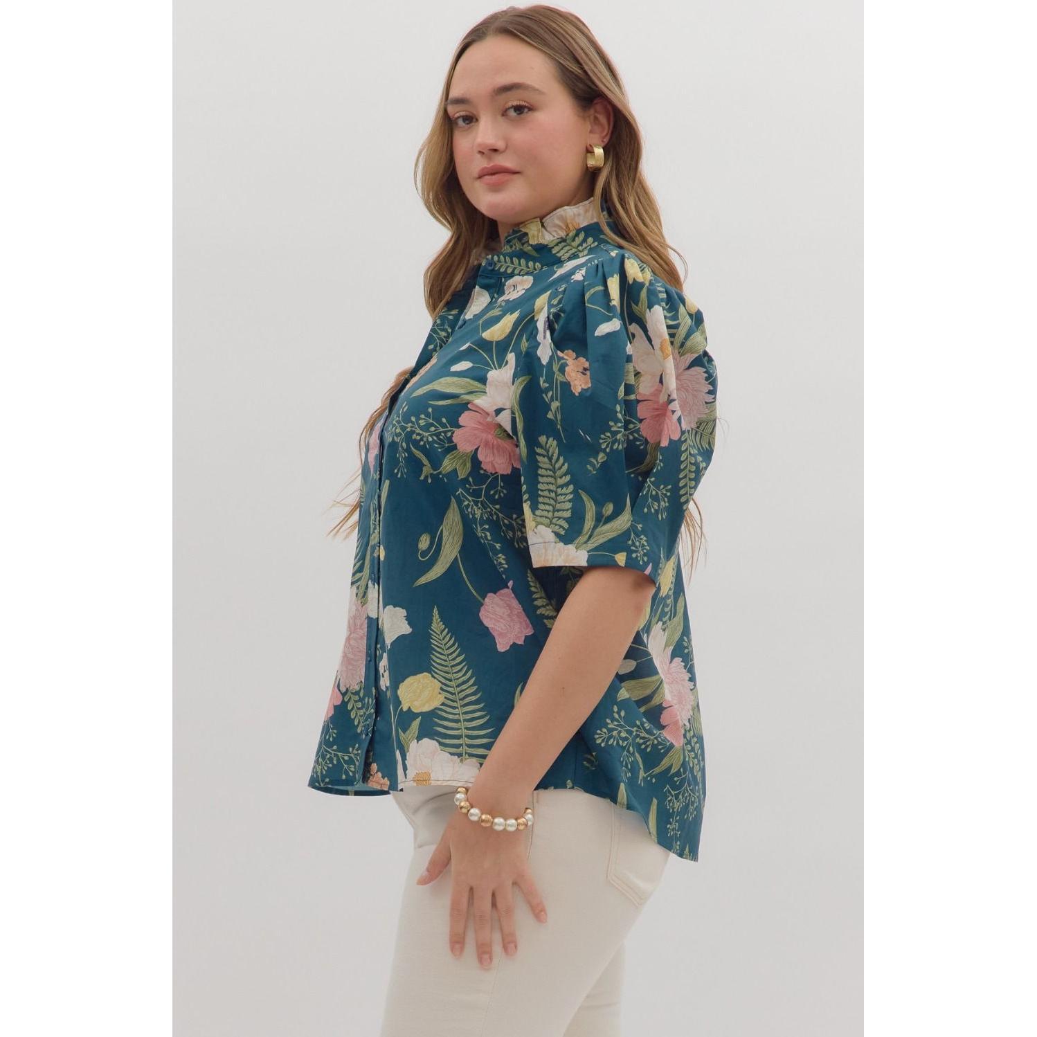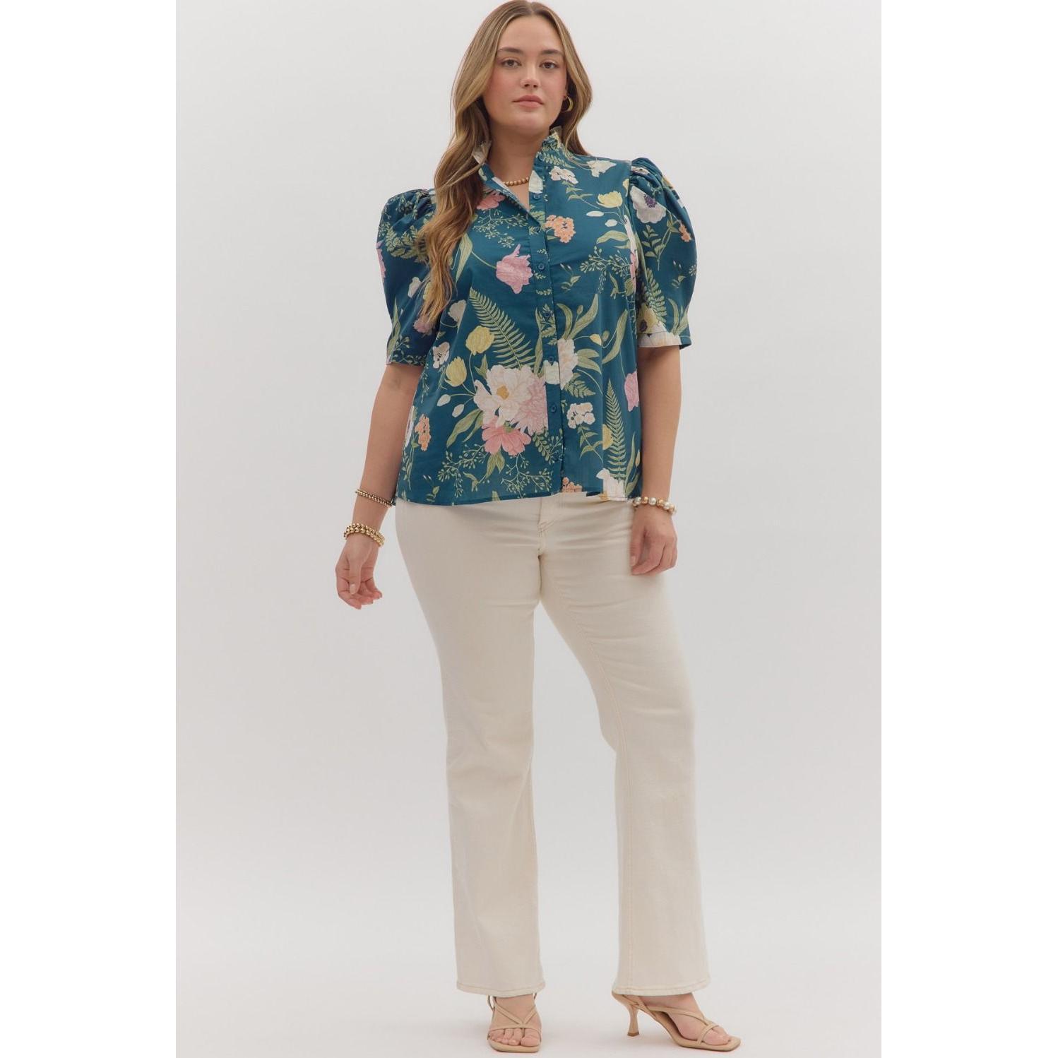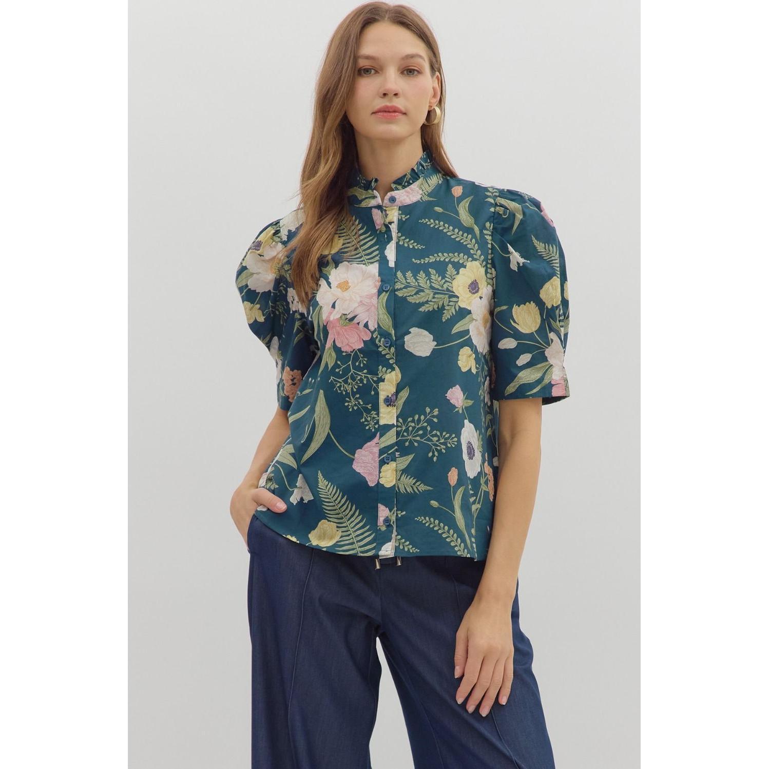 This teal short-sleeved top features a delicate floral pattern, offering a fresh and charming look for your wardrobe.