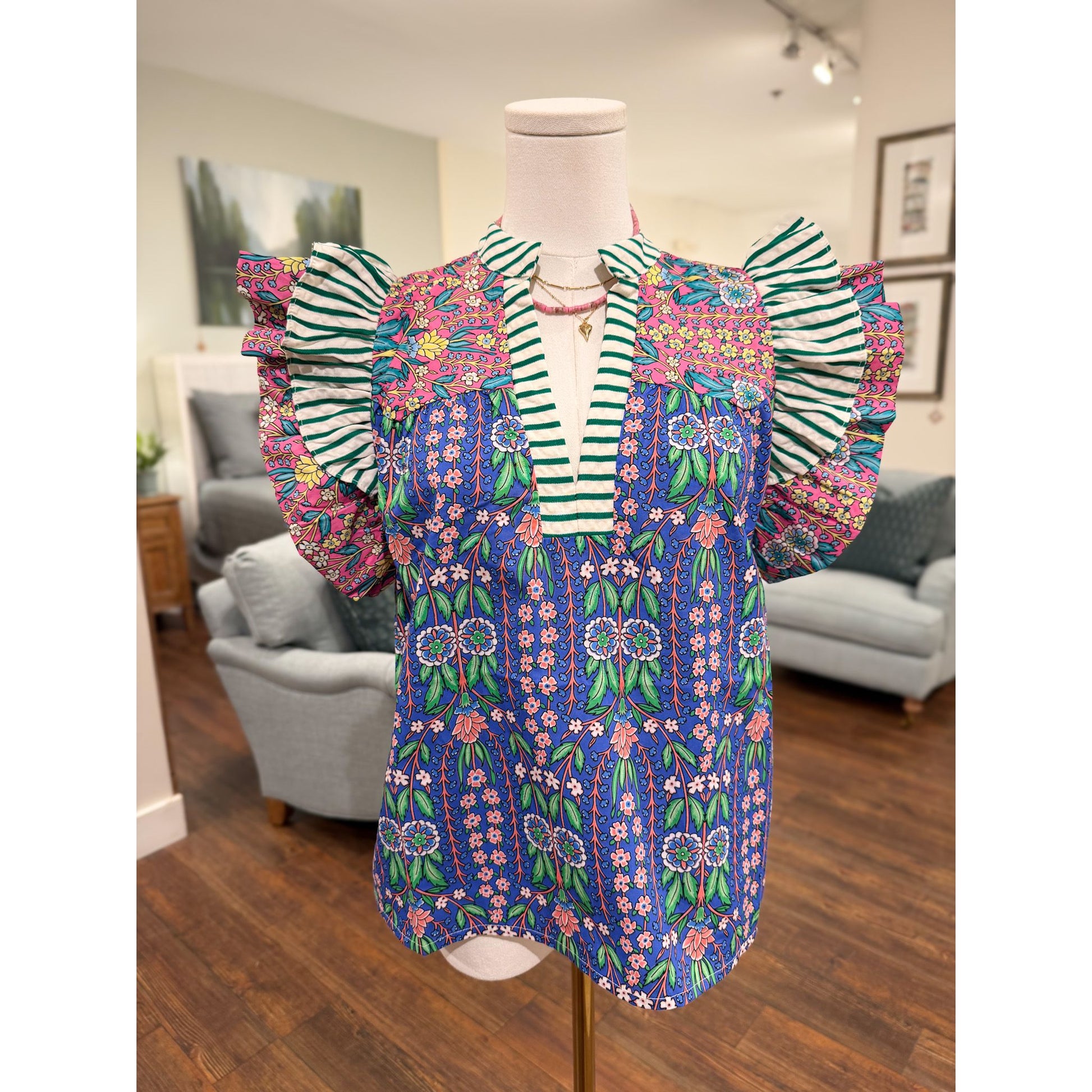 Elevate your wardrobe with the Suvi Top, a charming flutter sleeve design featuring a vibrant blue and pink floral print accented with soft green accents. This versatile piece brings effortless style and a pop of color to any ensemble.