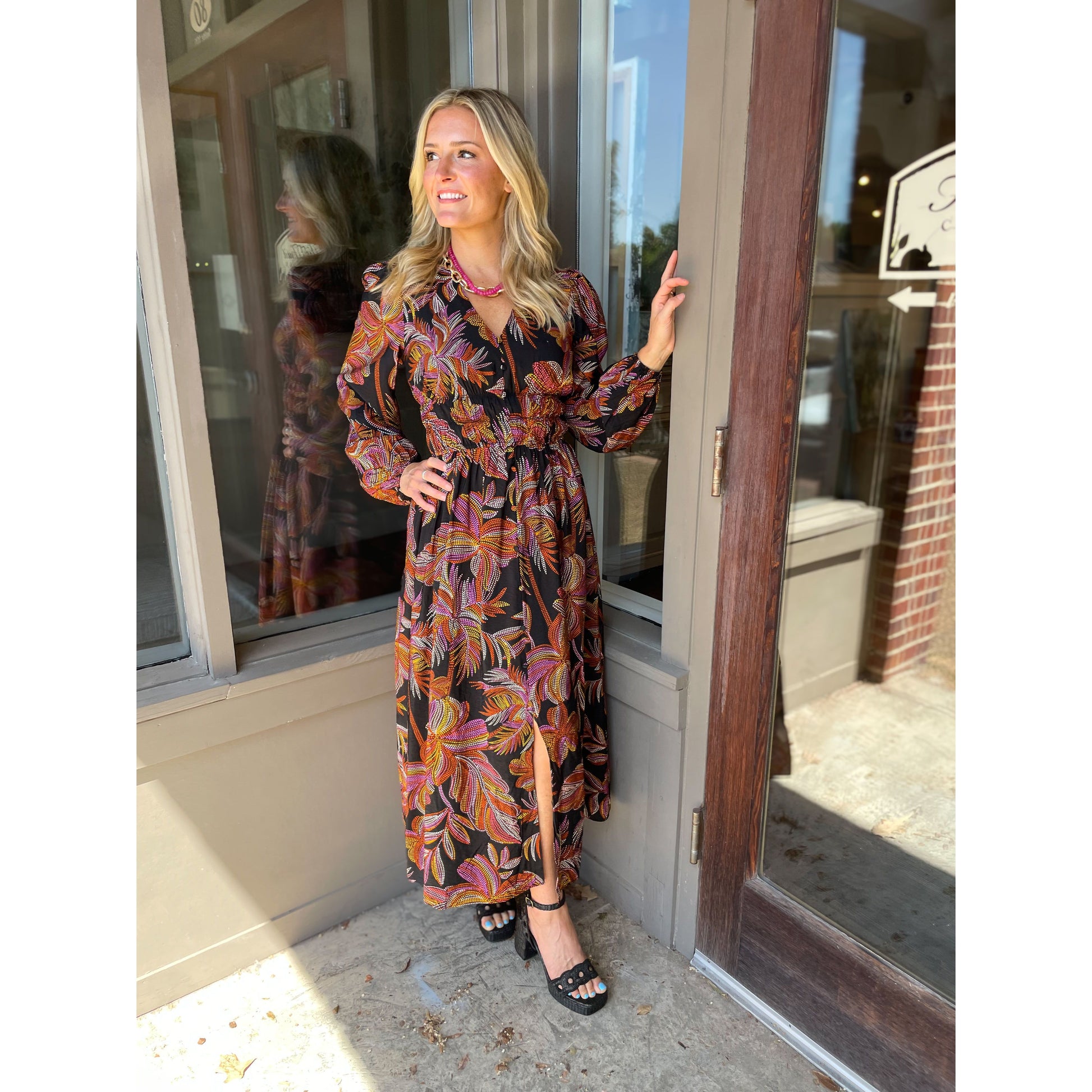 This leaf print midi dress features a V-neck and long sleeves with elasticized cuffs and waist for a comfortable fit. It includes a self-tie detail at the waist and a front slit for added style. The dress is lined, and the model is shown wearing a size small.