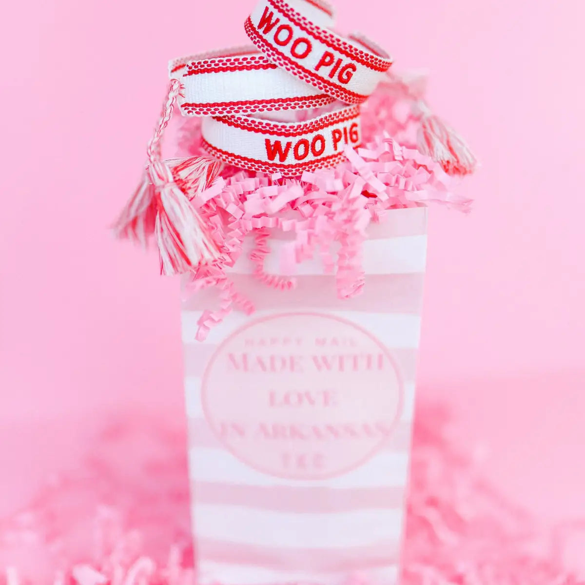 This white woven bracelet features red "woo pig" lettering, an adjustable design, and tassel details.