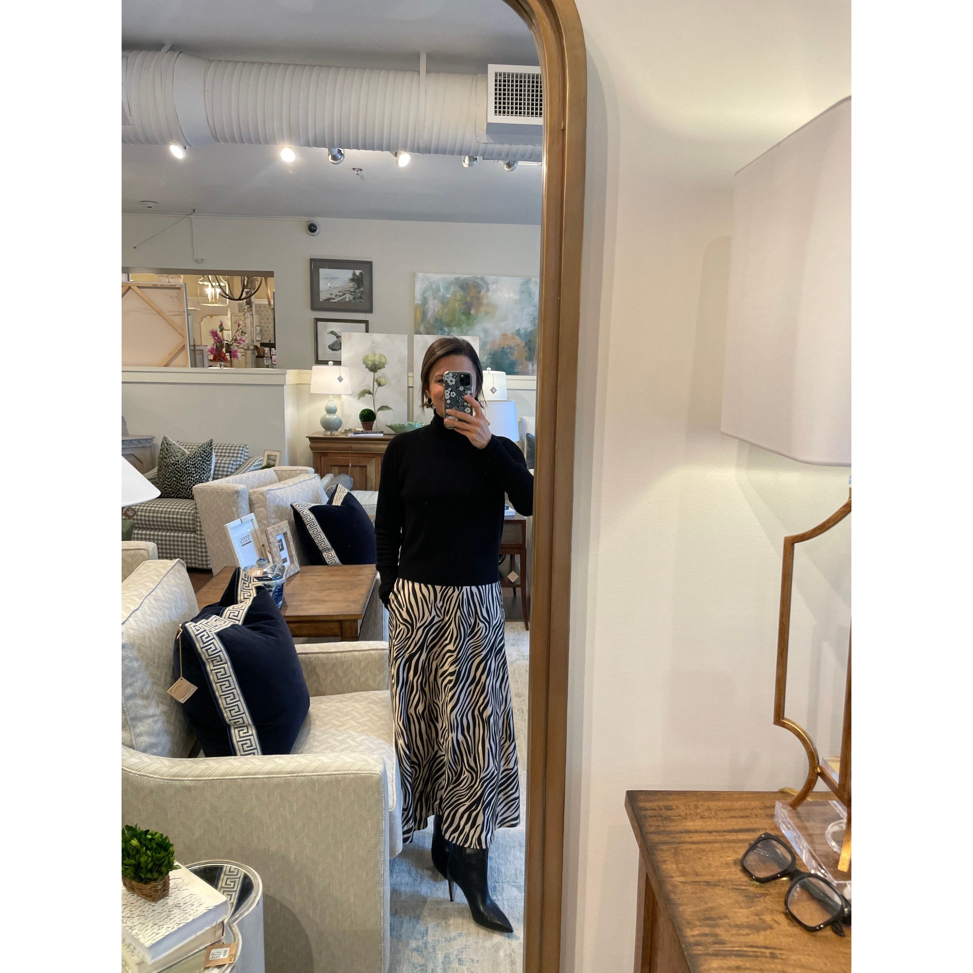 This zebra-striped skirt from Gretchen Scott Designs offers a luxuriously silky feel, combining style with exceptional softness for everyday comfort.